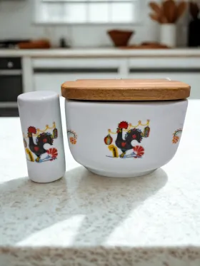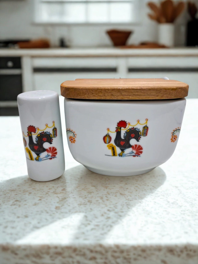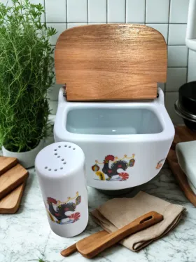 Este conjunto apresenta um design moderno e decoração linda, adaptando-se perfeitamente a diferentes ambientes. Sua construção em porcelana de alta qualidade garante durabilidade e resistência, permitindo que você o utilize no dia a dia sem preocupações. Com 500 g de capacidade do saleiro é perfeito para uso diário, mantendo tudo ao seu alcance.
